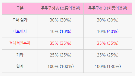하지만, "차등의결권"을 적용한다면 오너/대표의 지분이 70%에 이르고, 적대적 인수자쪽이 60%가 됩니다.
